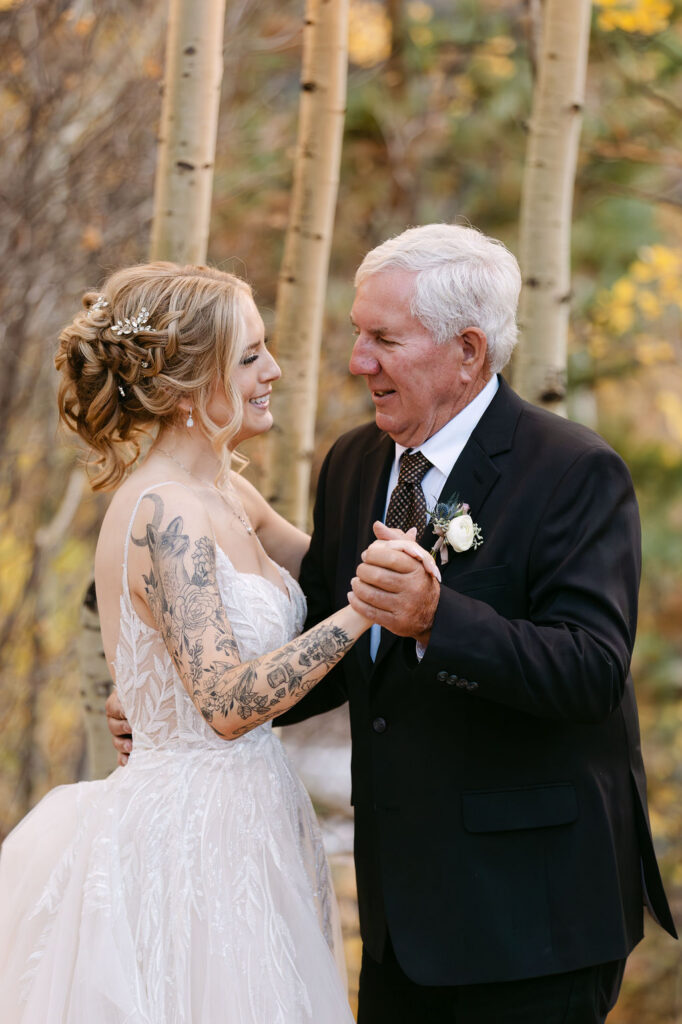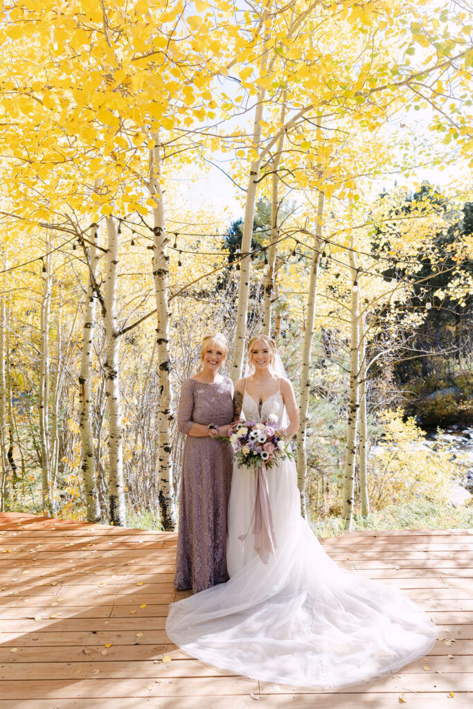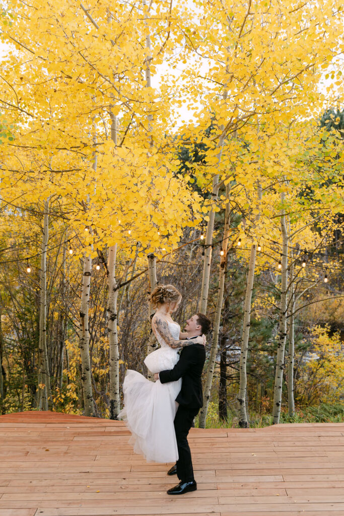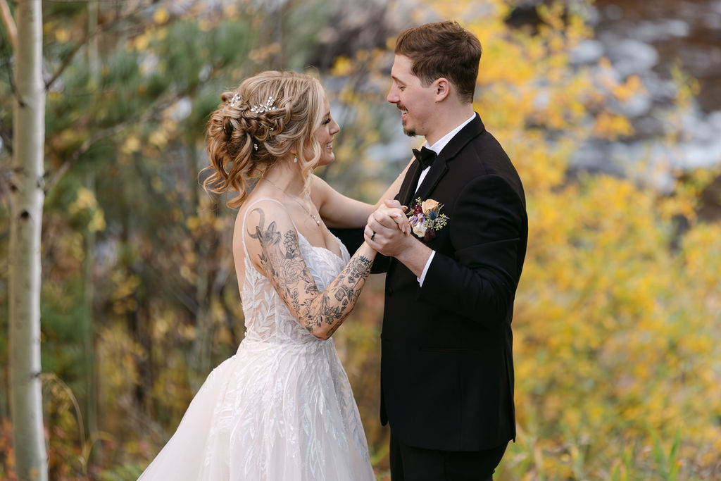 One of my favorite moments from the Wild Basin Lodge wedding pictured in this guide was when my couple chose to have their first dance outdoors on the riverside deck under the string lights instead of inside. It was intimate, emotional, and such a perfect reflection of the venue’s flexibility and charm. Plus, the aspens were popping and it was an unbelievable scene!